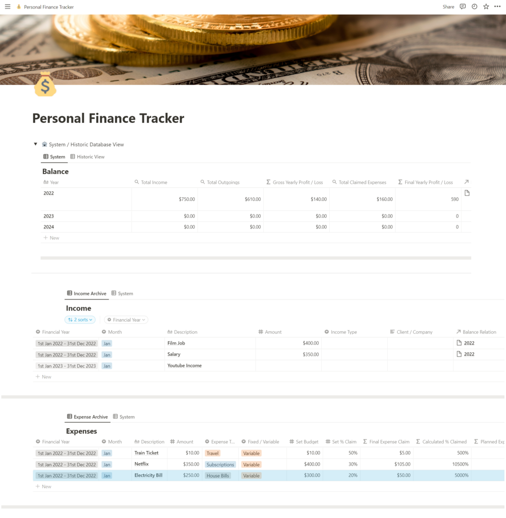 This is a digital personal finance tracker designed to help you map out your Bill, Subscription, Total income, Total Expenses and this also includes formula's that calculate the return on Tax returns as well. This sort of gives you a birds eye view of your Finances.